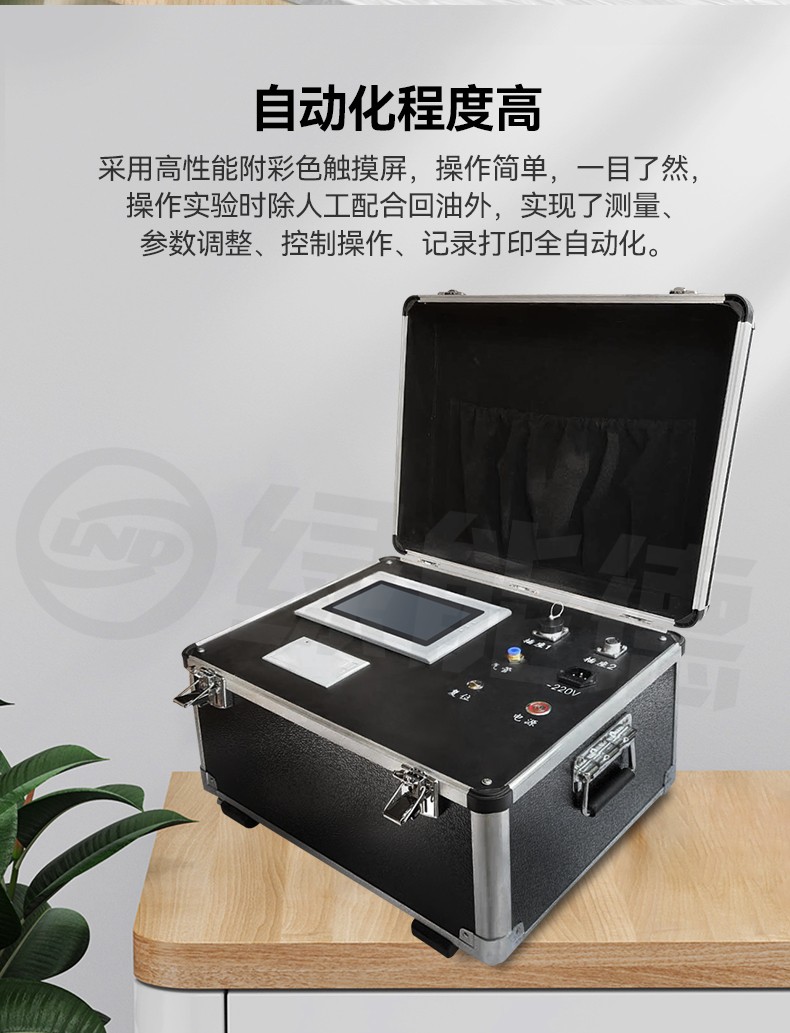 2. 本测试仪自动化程度高。采用高性能附彩色触摸屏,操作简单,一目了然,操作实验时除人工配合回油外,实现了测量、参数调整、控制操作、记录打印全自动化。