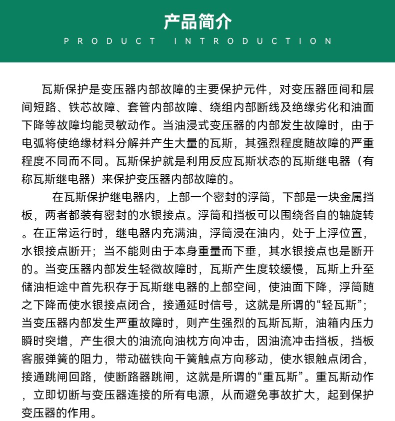 瓦斯保护是变压器内部故障的主要保护元件,对变压器匝间和层间短路、铁芯故障、套管内部故障、绕组内部断线及绝缘劣化和油面下降等故障均能灵敏动作。当油浸式变压器的内部发生故障时,由于电弧将使绝缘材料分解并产生大量的瓦斯,其强烈程度随故障的严重程度不同而不同。瓦斯保护就是利用反应瓦斯状态的瓦斯继电器(有称瓦斯继电器)来保护变压器内部故障的。