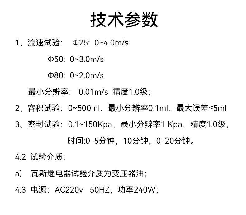 瓦斯继电器校验仪(机械部分):外型尺寸:70×30×60cm,重量35kg;